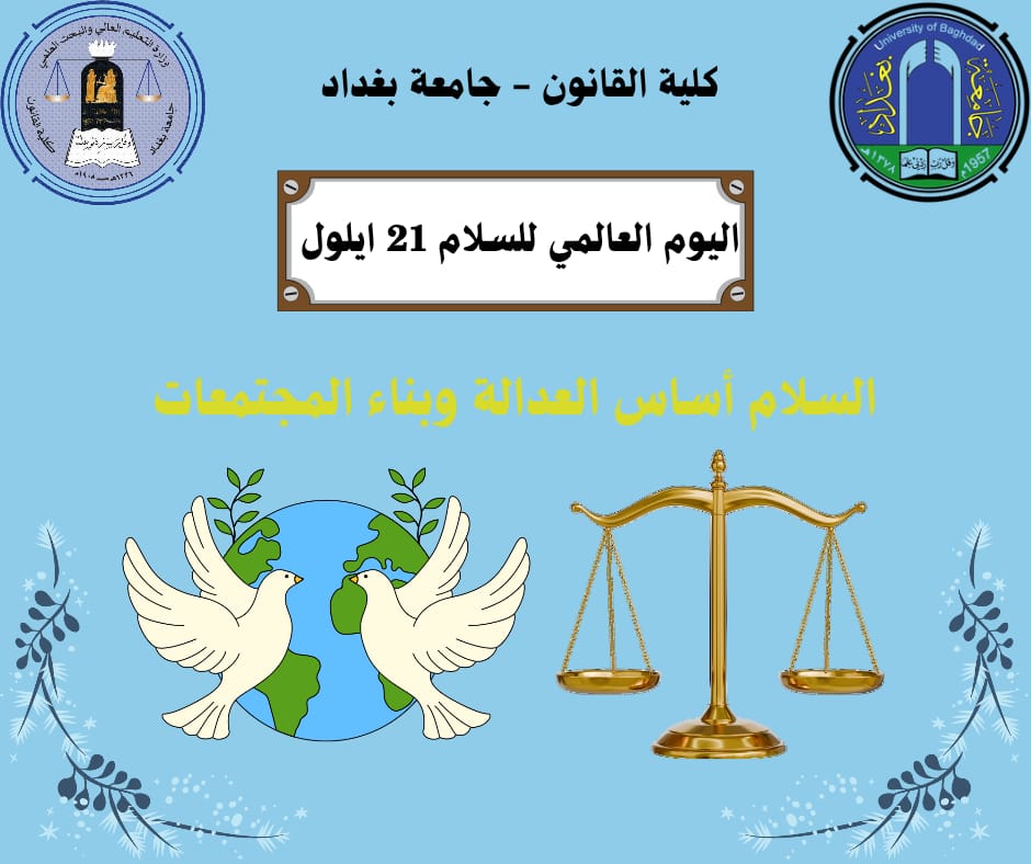 À l’occasion de la Journée internationale de la paix, célébrée chaque 21 septembre, la Faculté de Droit – Université de Bagdad réaffirme son engagement à promouvoir les valeurs de paix, de coexistence et de justice, fondements d’une société stable et prospère.