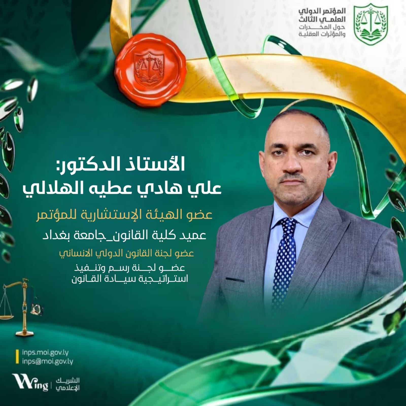 Dans le cadre de la coopération scientifique internationale, le professeur Dr. Ali Hadi Atiya Al-Hilali, doyen de la Faculté de Droit de l’Université de Bagdad, et le professeur Dr. Qaïd Hadi Dahesh, chef du département de droit pénal, ont été choisis membres du comité consultatif du troisième colloque international sur les drogues et les substances psychotropes, qui se tiendra à Tripoli du 25 au 28 novembre 2025.