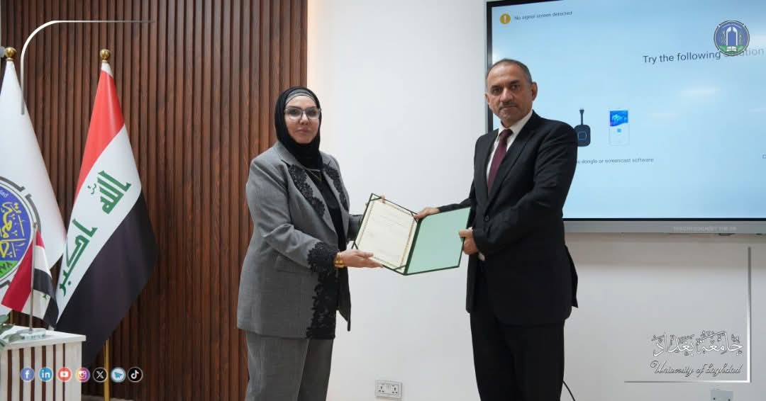 Le doyen de la Faculté de Droit de l’Université de Bagdad, Pr. Ali Hadi Atiya, accompagné du vice-doyen aux affaires administratives, Dr. Harith Ali Ibrahim, a participé au colloque scientifique organisé par l’Institut de génétique et de biotechnologie sous le thème : « La vision du droit et de la charia sur le génie génétique ».