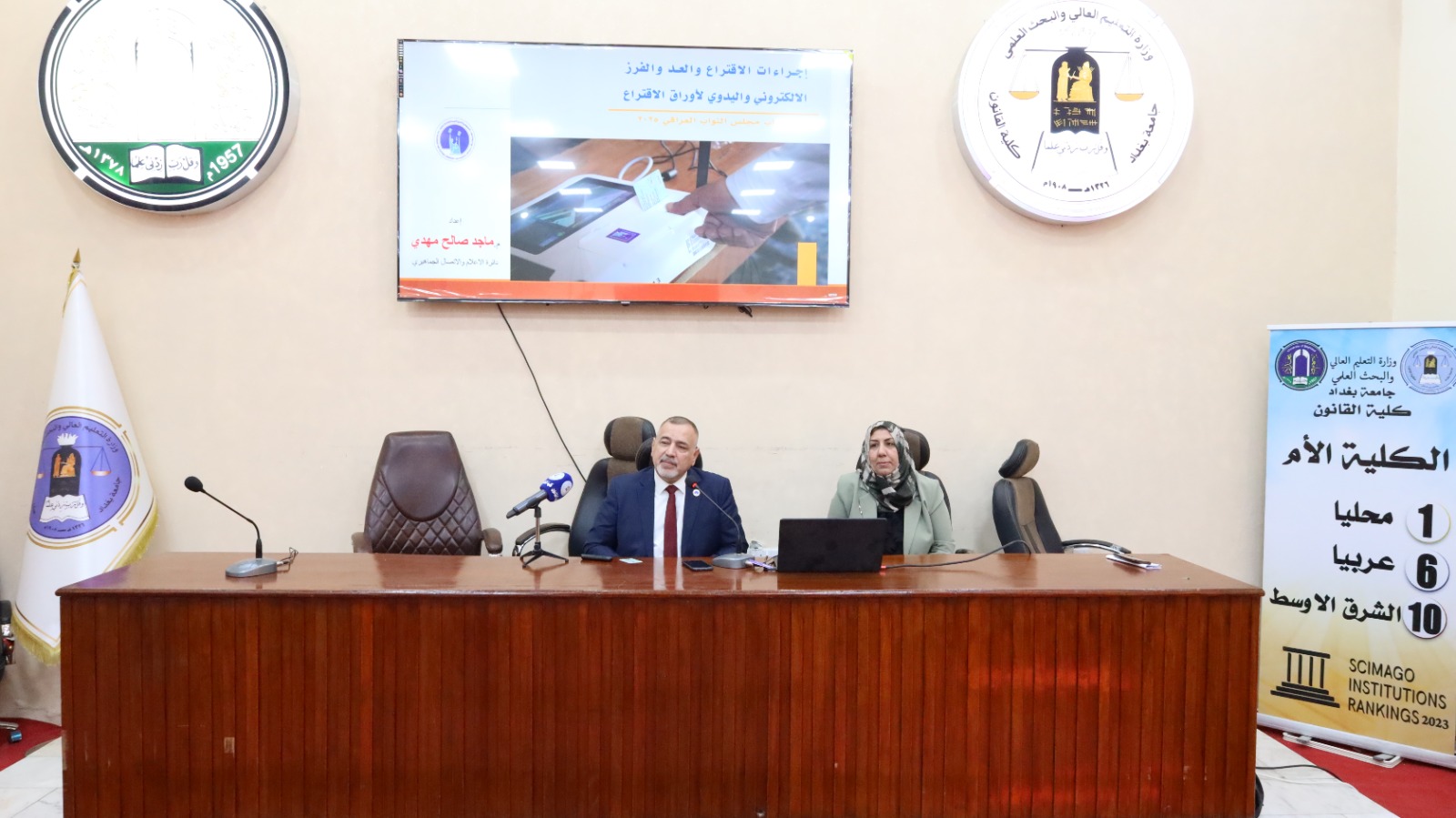 La Clinique juridique et de justice restaurative de la Faculté de Droit – Université de Bagdad, en collaboration avec la Haute Commission électorale indépendante, a organisé le mercredi 5 novembre 2025 un colloque intitulé « Les procédures de vote et la distribution de la carte biométrique ».