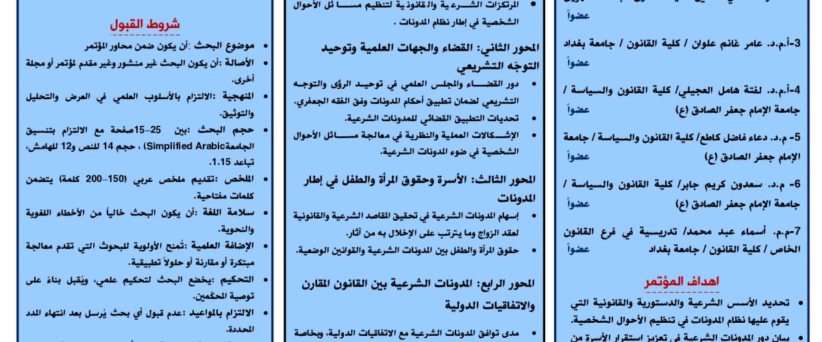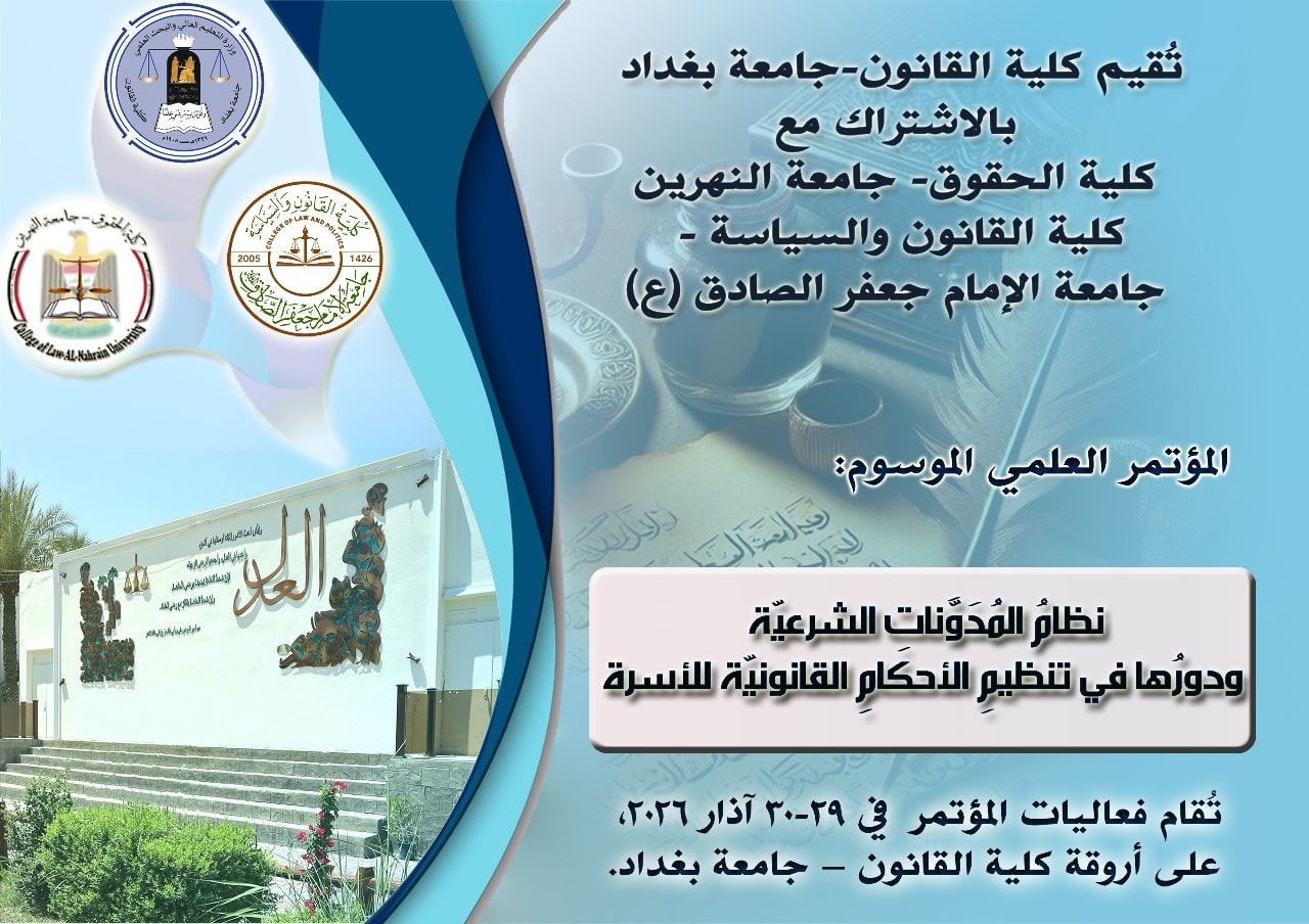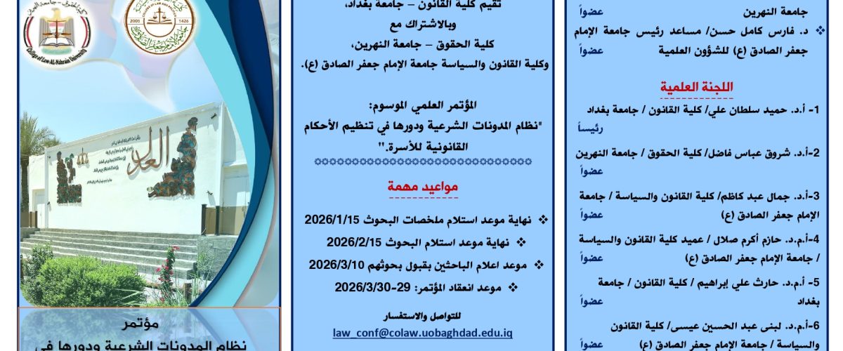 La Faculté de Droit de l’Université de Bagdad annonce l’organisation de sa conférence scientifique intitulé « Le système des codifications juridiques religieuses et son rôle dans la réglementation des dispositions juridiques de la famille », en collaboration avec la Faculté de Droit de l’Université Al-Nahrain et la Faculté de Droit et des Sciences Politiques de l’Université Al-Imam Jaafar Al-Sadiq.